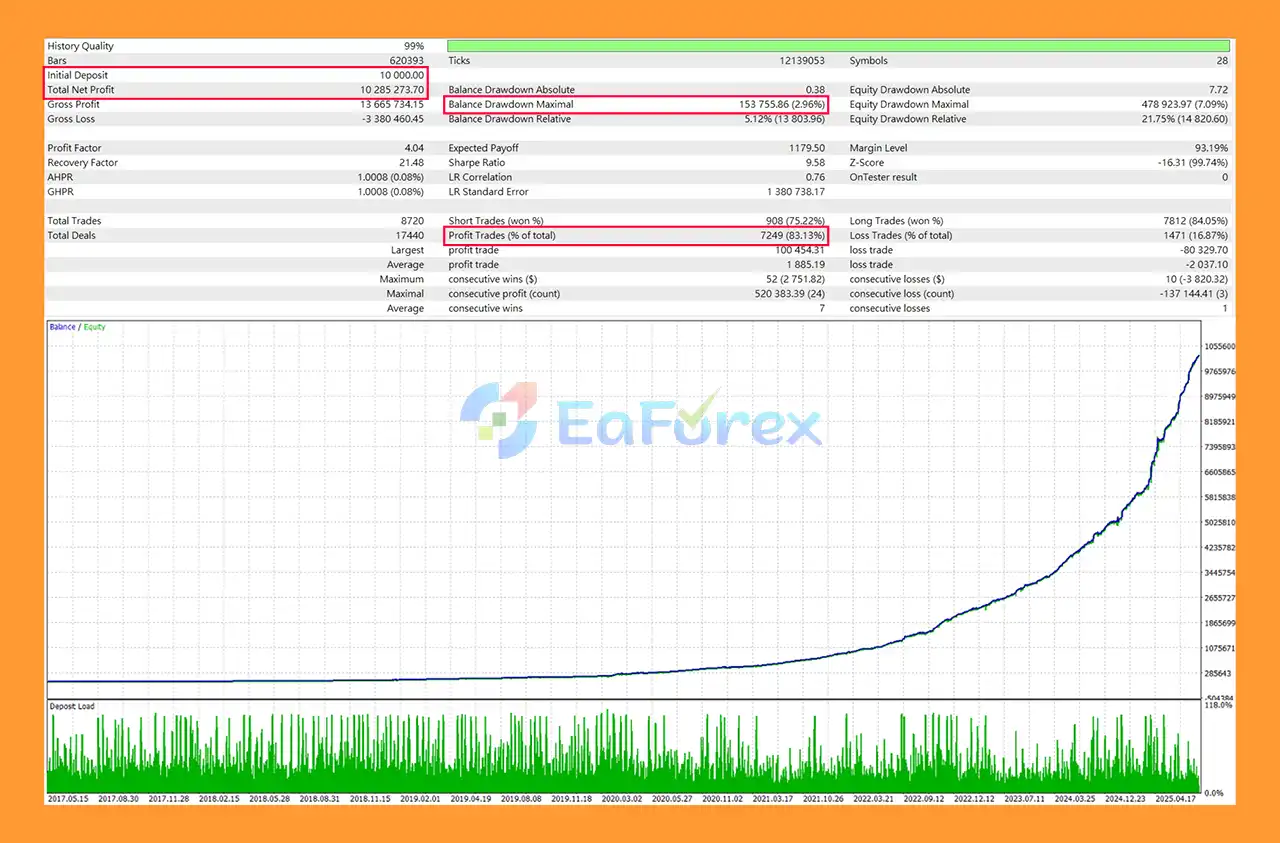 The EA is designed with a low-drawdown profile, using strict entry and exit logic, volatility adaptation, and diversified multi-pair trading to ensure smooth equity growth and capital protection.