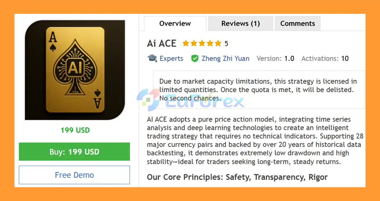 In summary, AI ACE EA MT5 is a robust, professional-grade automated trading system built for traders who prioritize safety, transparency, and long-term consistency. By combining pure price action with deep learning and time series analysis, it eliminates the need for technical indicators while adapting intelligently to changing market conditions. Developed by Zheng Zhi Yuan and validated through more than 20 years of rigorous backtesting, AI ACE EA MT5 delivers exceptionally low drawdown, diversified multi-pair exposure, and true plug-and-play simplicity. For traders seeking stable, data-driven, and fully automated forex trading on MetaTrader 5, AI ACE EA MT5 stands out as a highly reliable solution.