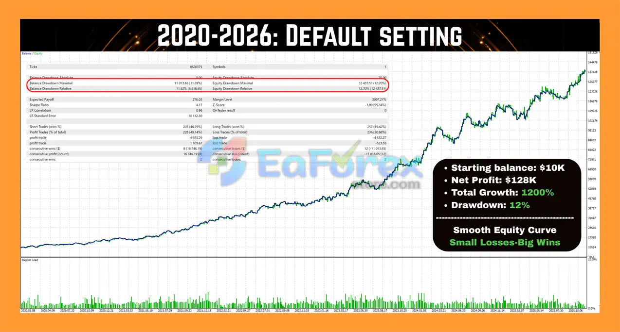 Backtests show significant long-term performance, including up to $127,000 profit from a $10,000 deposit over 6 years, with controlled drawdown levels depending on risk settings.