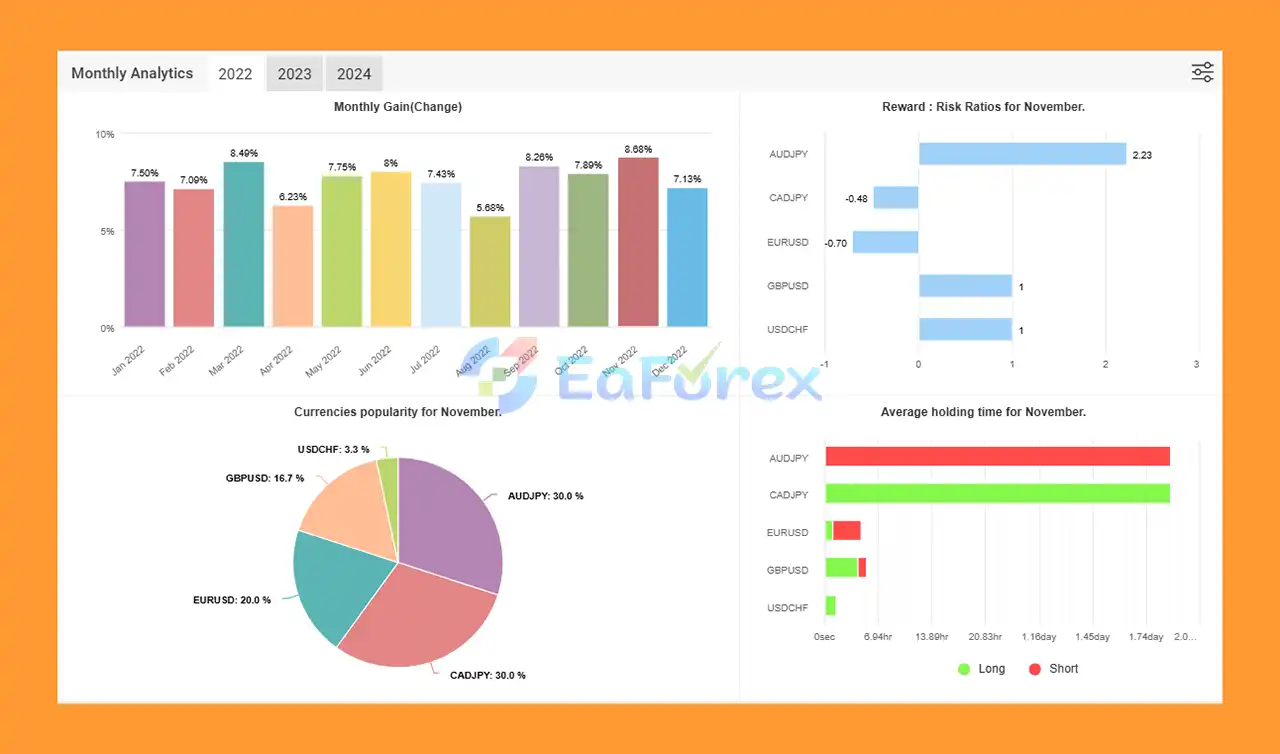 According to verified Myfxbook data, the EA achieved over +493% total gain, 7.41% average monthly growth, and a maximum drawdown of just 10.32%, proving its long-term stability.
