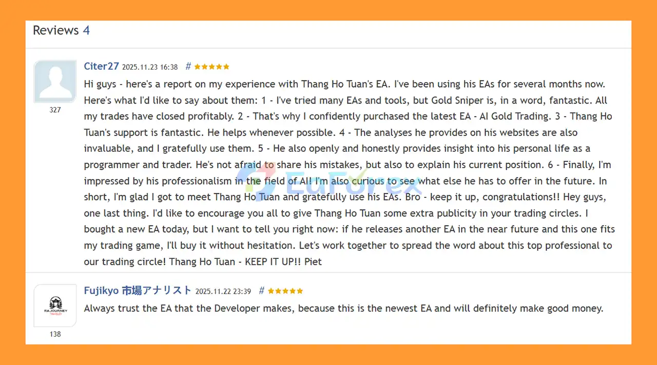 🔺AI Gold Trading MT5 is highly appreciated by the MQL5 community for bringing stable and reliable profits. Below are 5 star reviews from users: