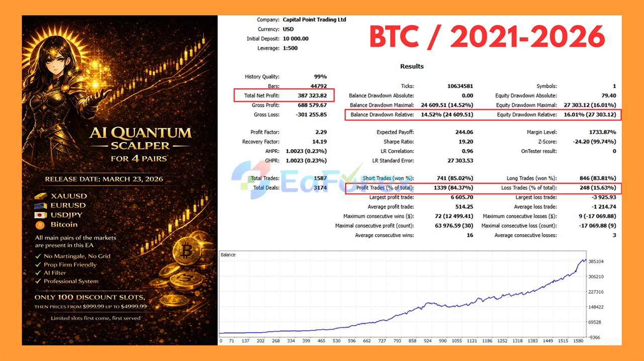 Backtesting results vary by asset, but historical data shows strong performance across multiple markets with high win rates and controlled drawdowns. For example, backtests on EURUSD, BTCUSD, and XAUUSD have demonstrated consistent profitability over multi-year periods under optimized conditions.