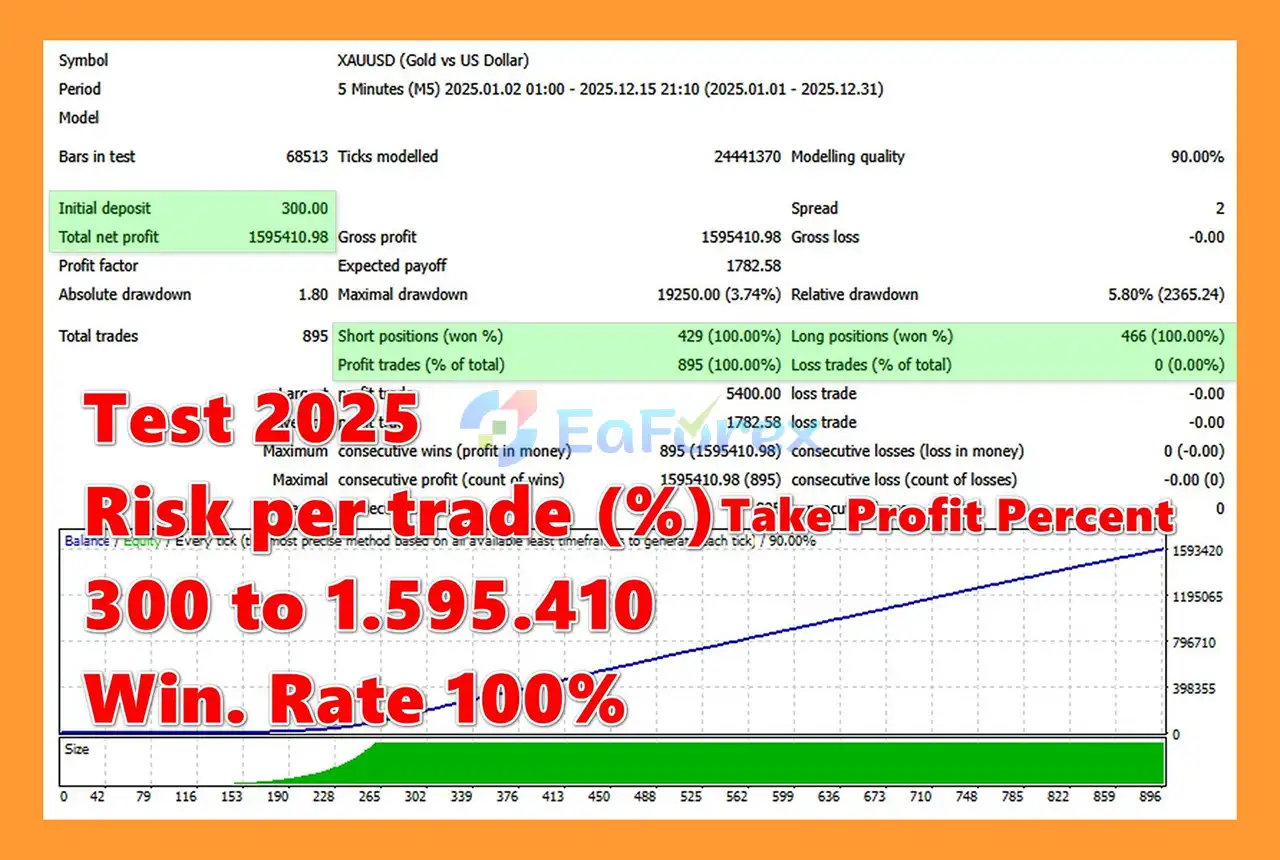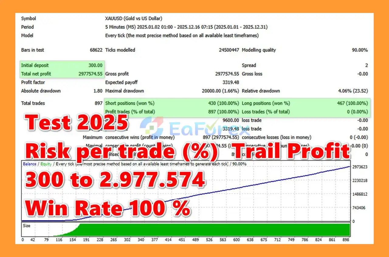 The recommended minimum deposit is $300, which allows the EA to operate effectively with proper risk-based position sizing and capital protection features.