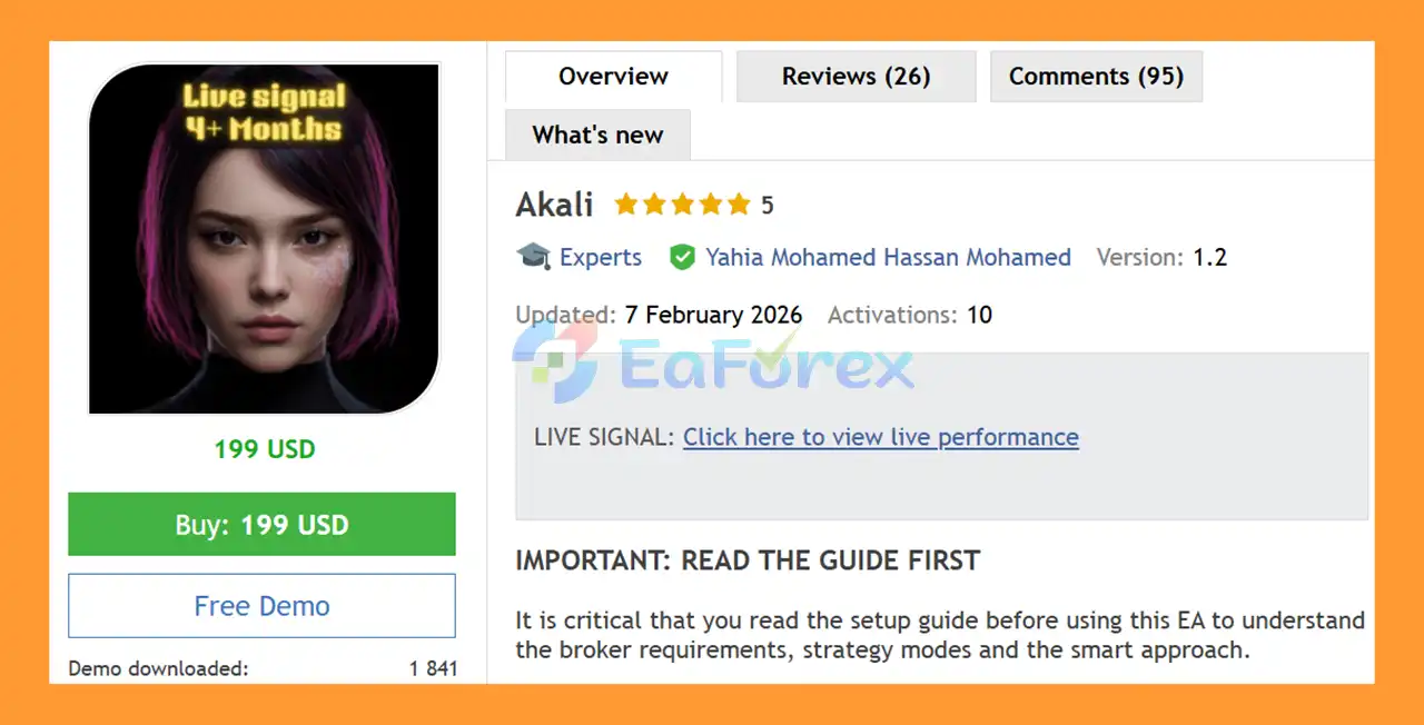 • Aymeric59 (2026.02.21): “I am extremely satisfied with Akali EA. The live results clearly demonstrate the quality of the strategy. Excellent work from the developer — highly recommended.”