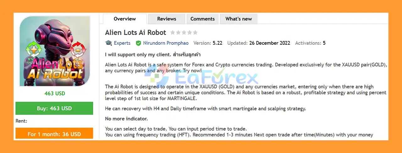 • Alien Lots AI Robot EA MT4 is an AI-based automated trading system optimized for XAUUSD (Gold), supporting Forex and cryptocurrency trading with high-probability logic.