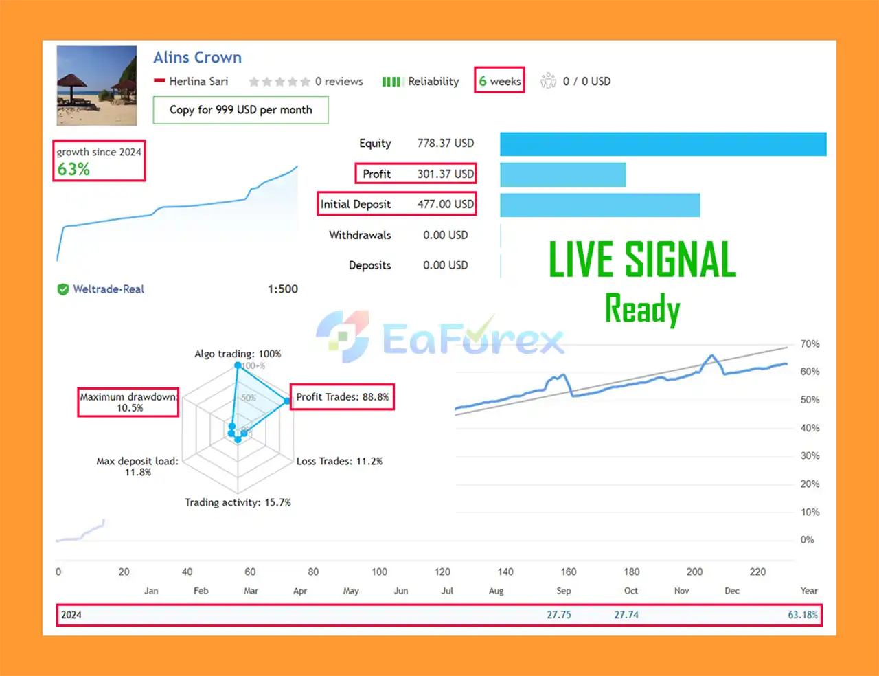 In live trading, the EA achieved +63.18% total growth, an 88.8% win rate, and only 10.5% maximum drawdown, proving its reliability and efficiency.