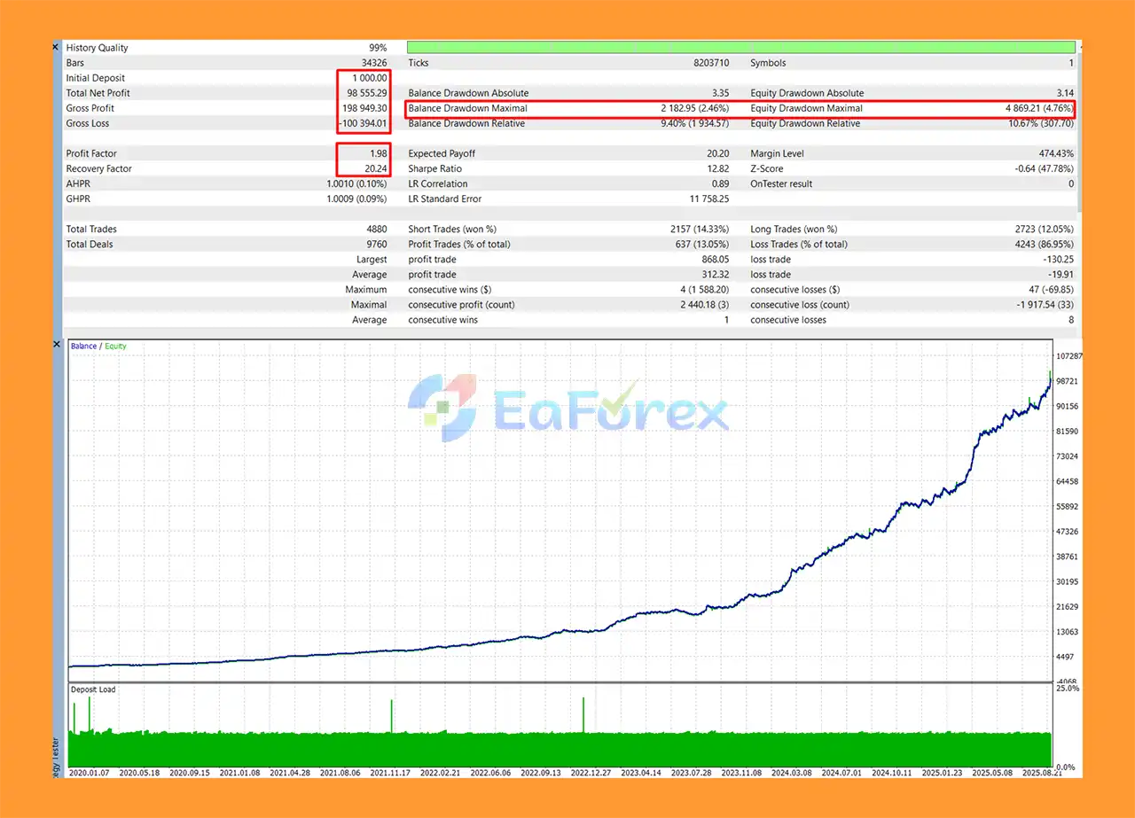 Starting with a $1,000 deposit, AlphaCore achieved $98,555 in profit, with only 2.46% drawdown and 13.5% win rate, proving its high reward-to-risk and low-risk exposure design.