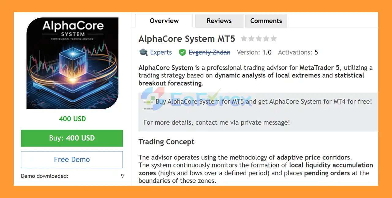 • Notable Products: AlphaCore System MT5 and other advisors.