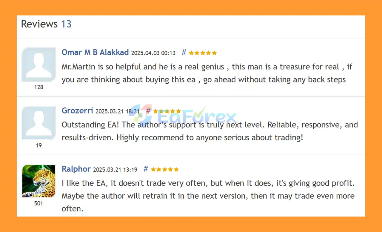 🔻AlphaFlow EA MT5 is highly appreciated by the MQL5 community for bringing stable and reliable profits. Below are 5 star reviews from users: