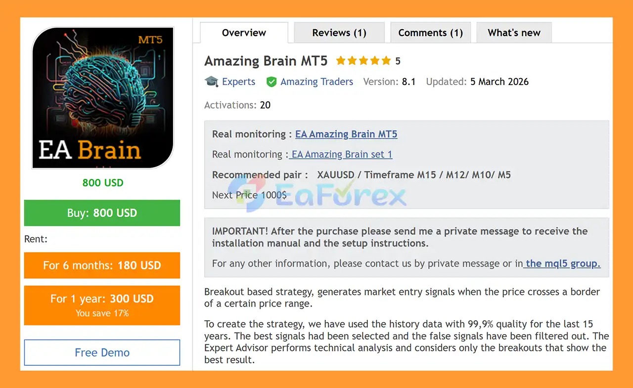 Amazing Brain MT5 is a breakout-based EA optimized for XAUUSD, using advanced filters, small Stop Loss, and trailing stop to capture strong moves.