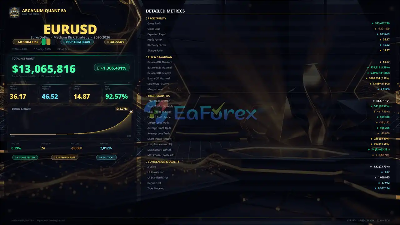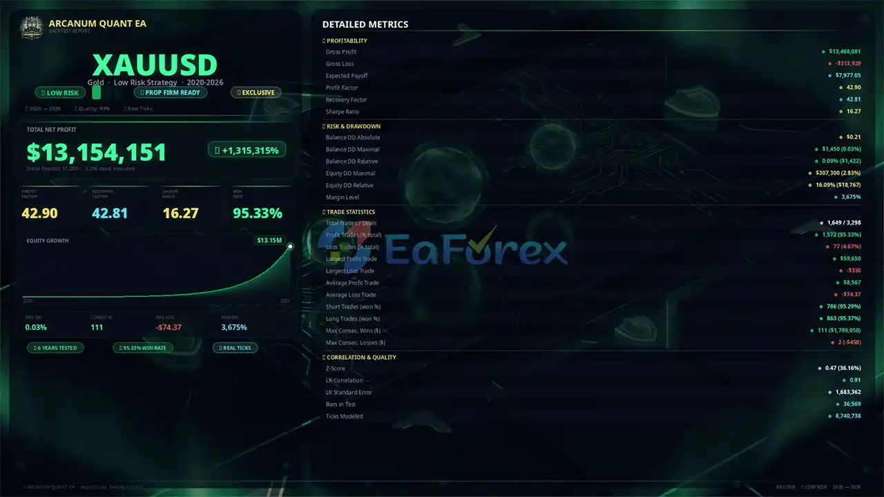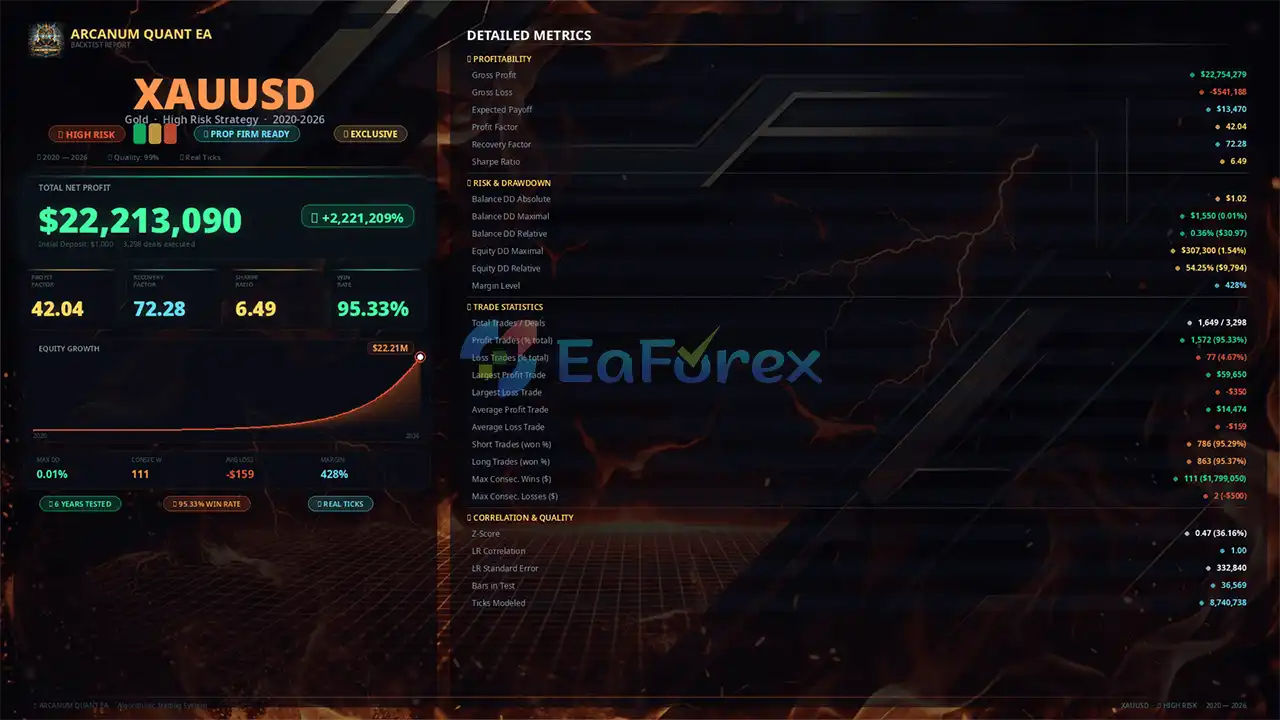 Arcanum Quant EA MT5 is a quantitative trading EA for XAUUSD & EURUSD, using multi-layer analysis and adaptive volatility for consistent, low-risk profits.