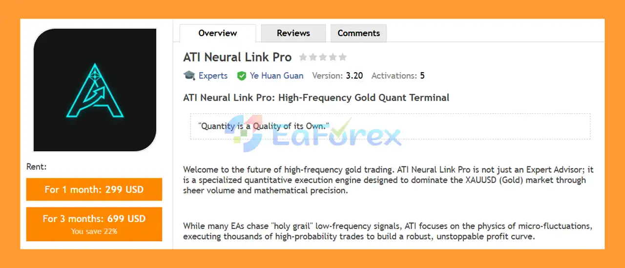 ATI Neural Link Pro EA MT4 is a high-frequency Expert Advisor designed for trading gold (XAUUSD) on MetaTrader 4. It uses a quantitative, mean-reversion strategy to capture small price movements on the M1 timeframe.