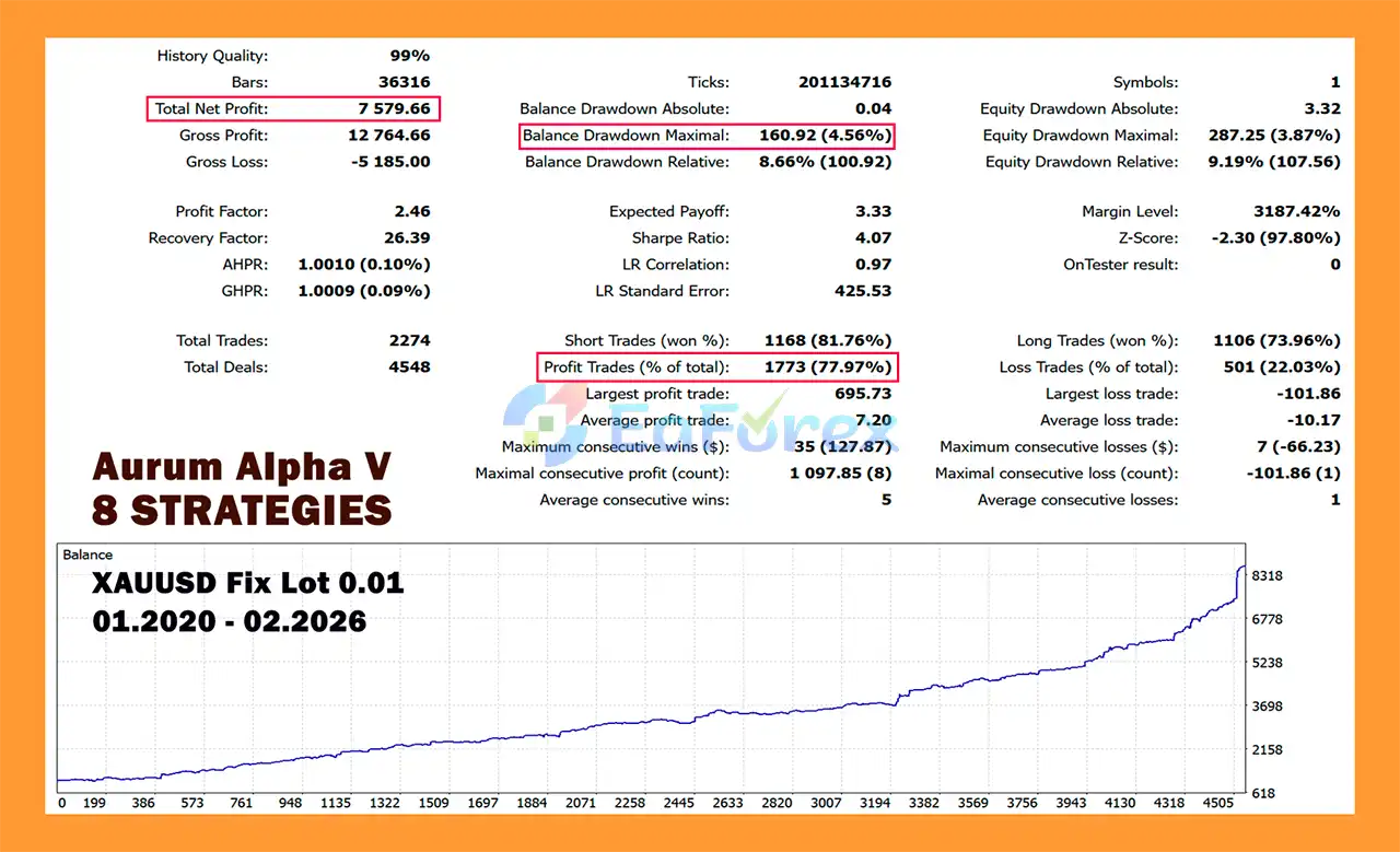 Aurum Alpha V EA MT5 is an 8-in-1 Gold trading robot, combining multi-strategy XAUUSD H1 execution, strict risk control, and no martingale or grid logic.