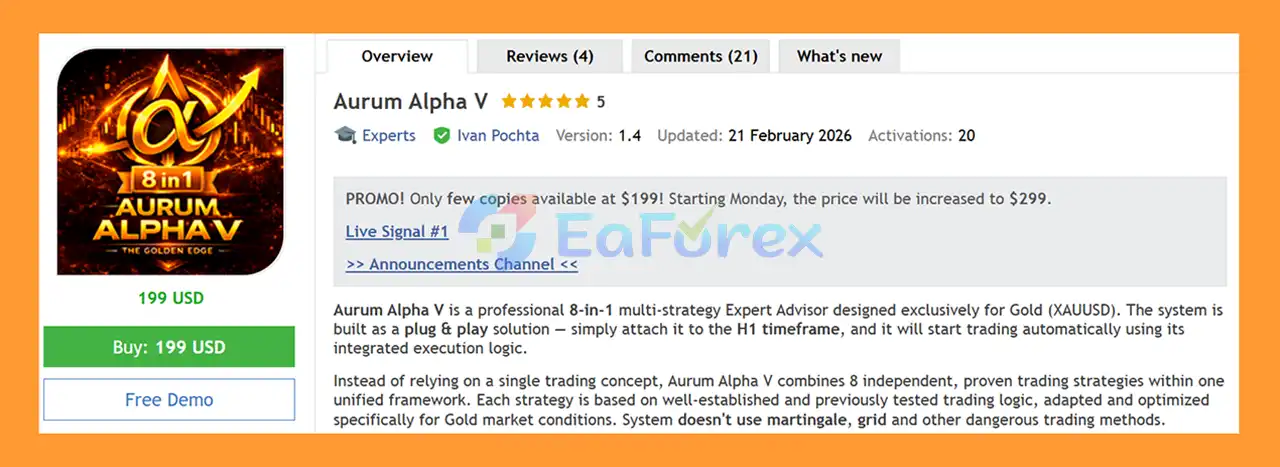 • Kwikky69 (2026.02.19): “Aurum Alpha V is one of those rare MT5 EAs that feels genuinely engineered rather than merely assembled. It launched with five beautifully diversified gold‑trading strategies, and the developer Ivan, has already expanded that to seven, with an eighth on the way—each one thoughtfully designed, rigorously tested, and contributing to a remarkably consistent win rate above 90% to date.”