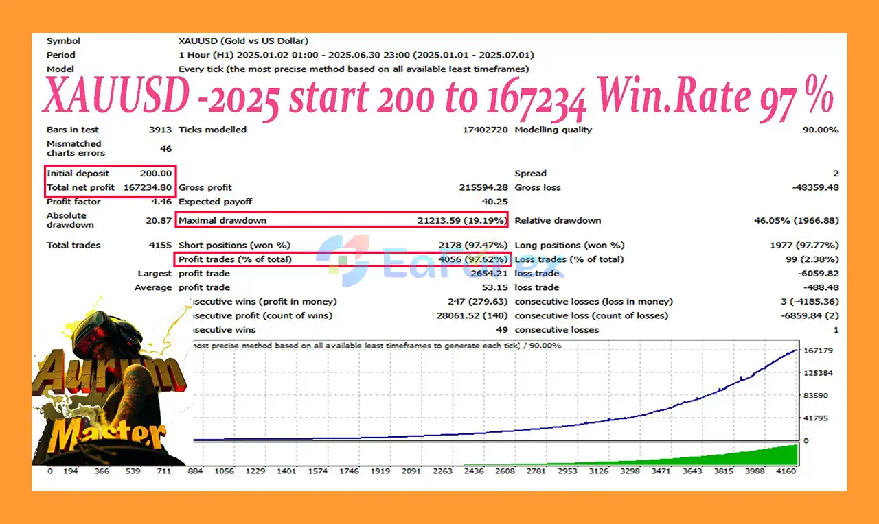 In a 6-month backtest on the XAU/USD 1-hour chart, Aurum Master EA MT4 achieved: