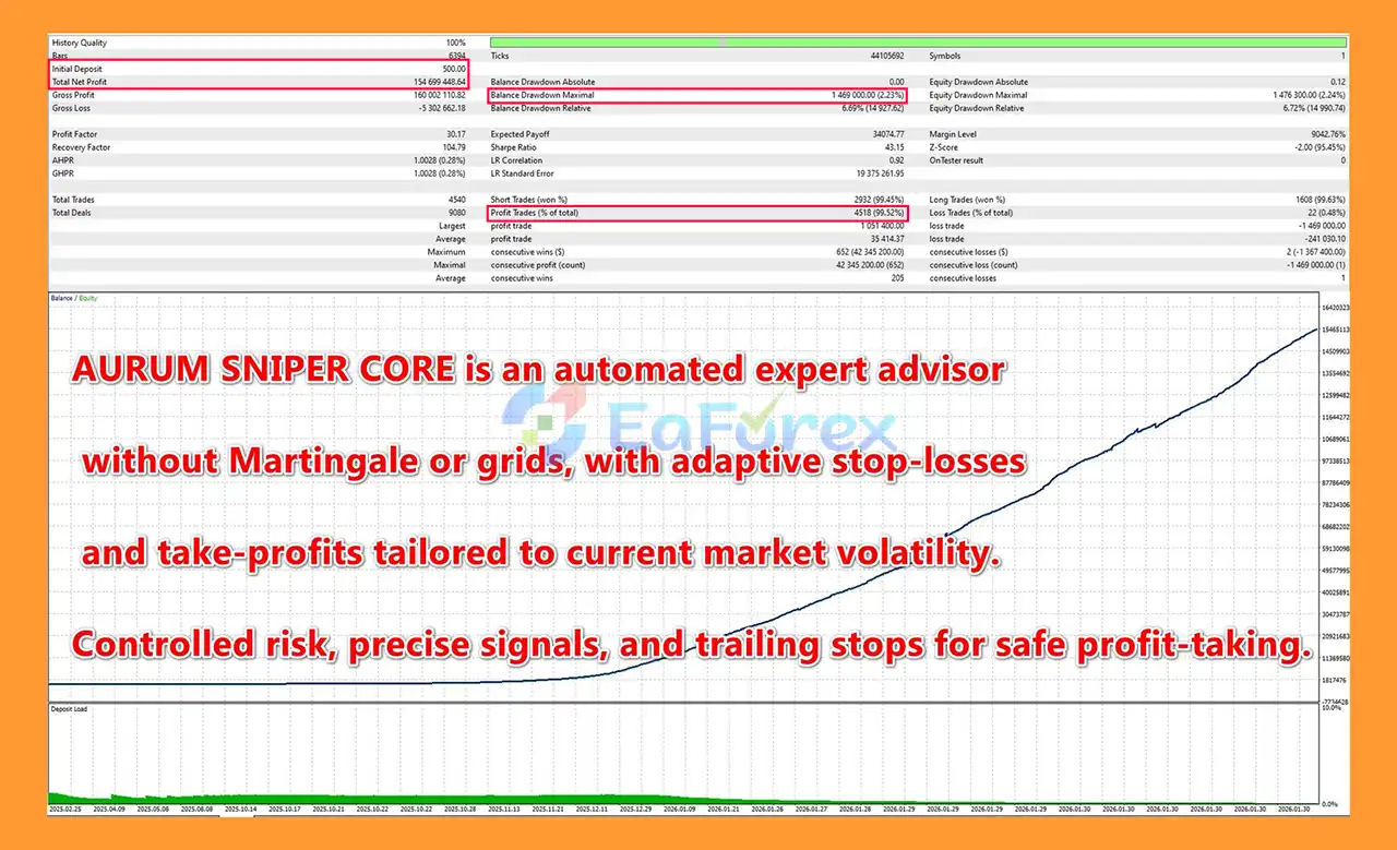 In summary, Aurum Sniper Core EA MT5 is a risk-focused, fully automated gold trading robot built for MetaTrader 5. Designed specifically for XAUUSD, it uses impulse-based entry logic, ATR volatility analysis, and an AI-adaptive SL/TP system to deliver precise and controlled trade execution. By avoiding martingale, grid trading, and averaging strategies, this MT5 Expert Advisor prioritizes capital preservation and disciplined single-position management.
