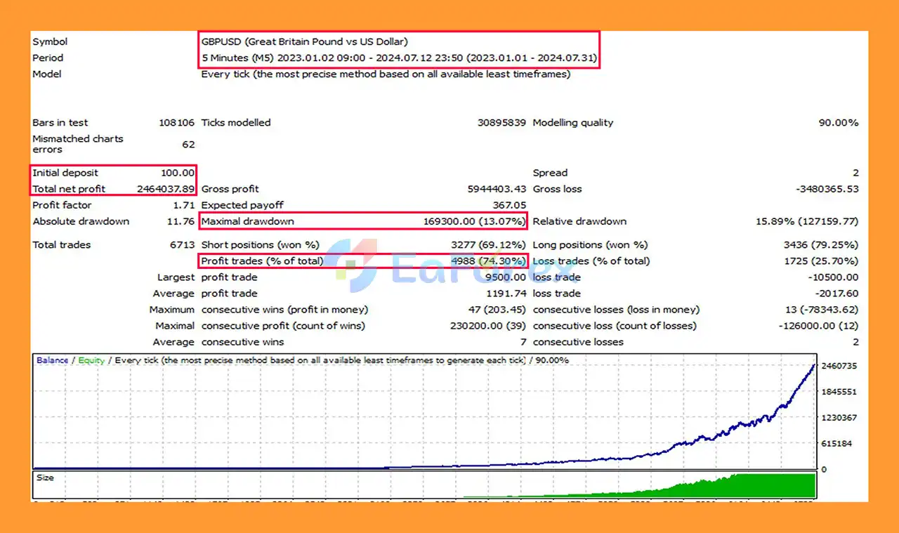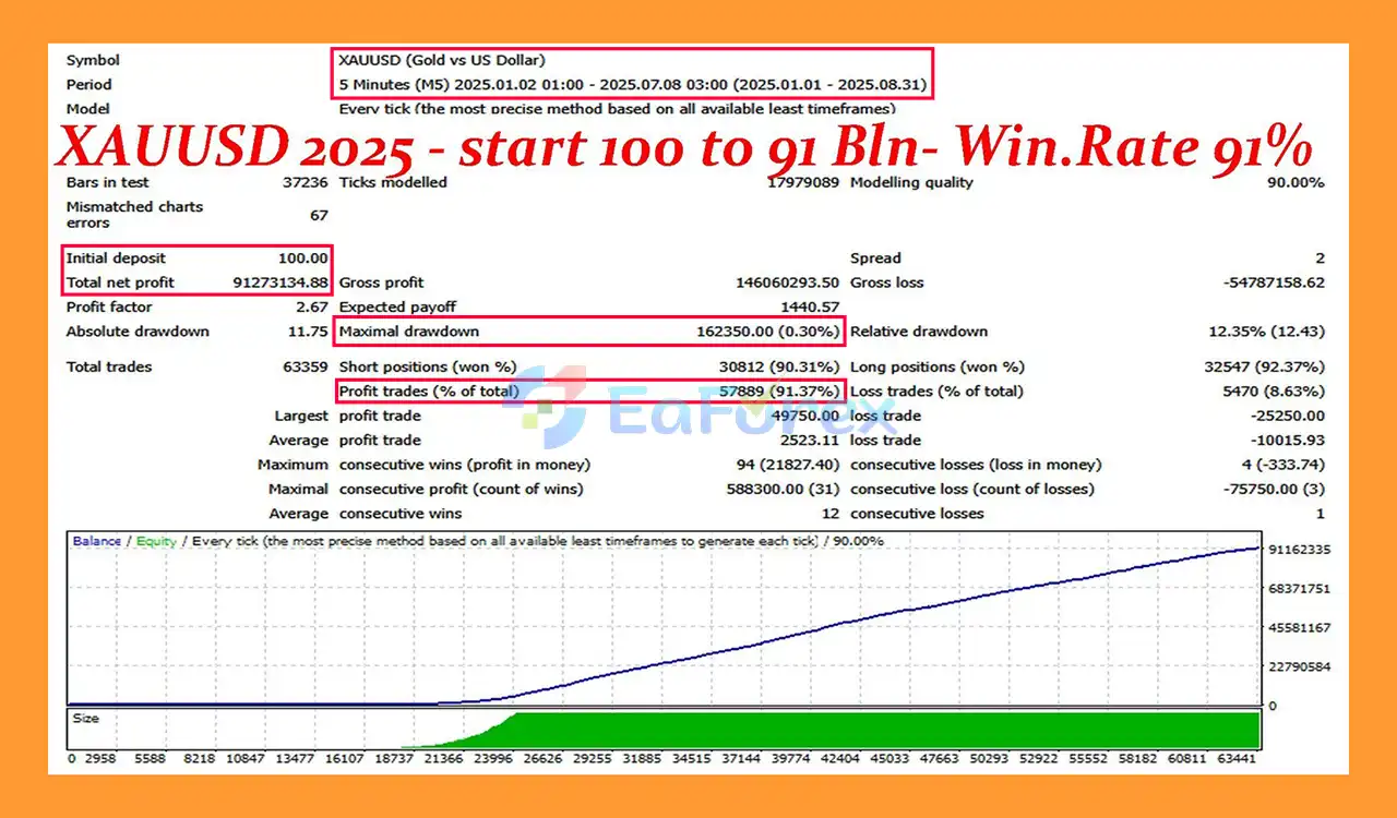 Backtests show a $100 initial deposit growing to $91.27 million on XAU/USD over 8 months with a 91.37% win rate and 0.30% maximum drawdown, and $2.46 million on GBP/USD over 7 months with a 74.30% win rate. Results may vary depending on market conditions.