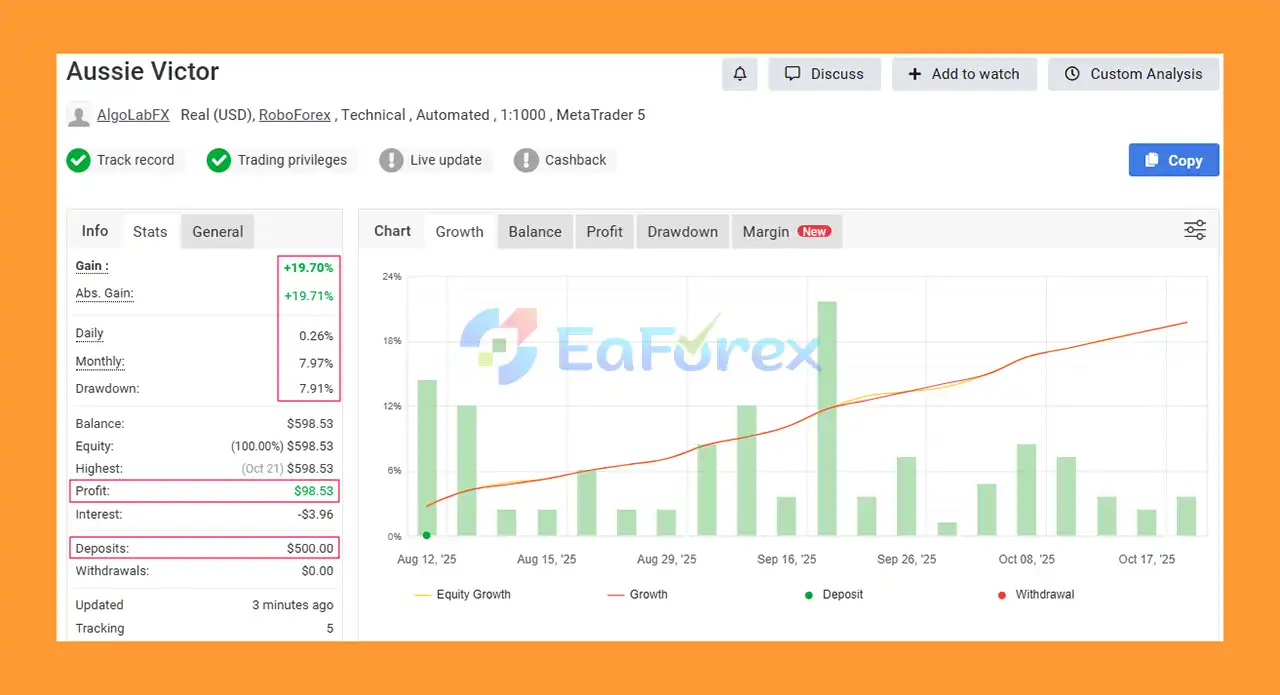 Aussie Victor MT5 works best with low-spread, fast-execution brokers and is optimized for VPS setups to ensure uninterrupted 24/5 trading. Its prop-firm-friendly design also makes it suitable for funded account programs.
