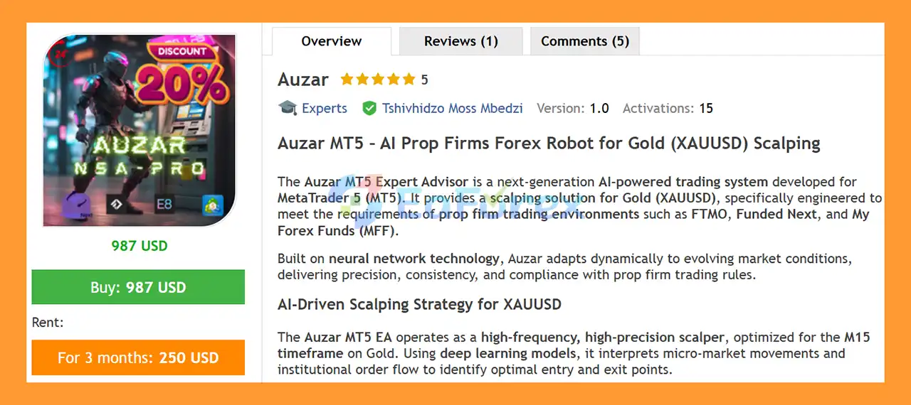 • Notable Products: Auzar MT5, Apex Drawdown Zero MT5, Vader Volatility Trading System MT5, PropTradeMaster MT5 and other advisors.