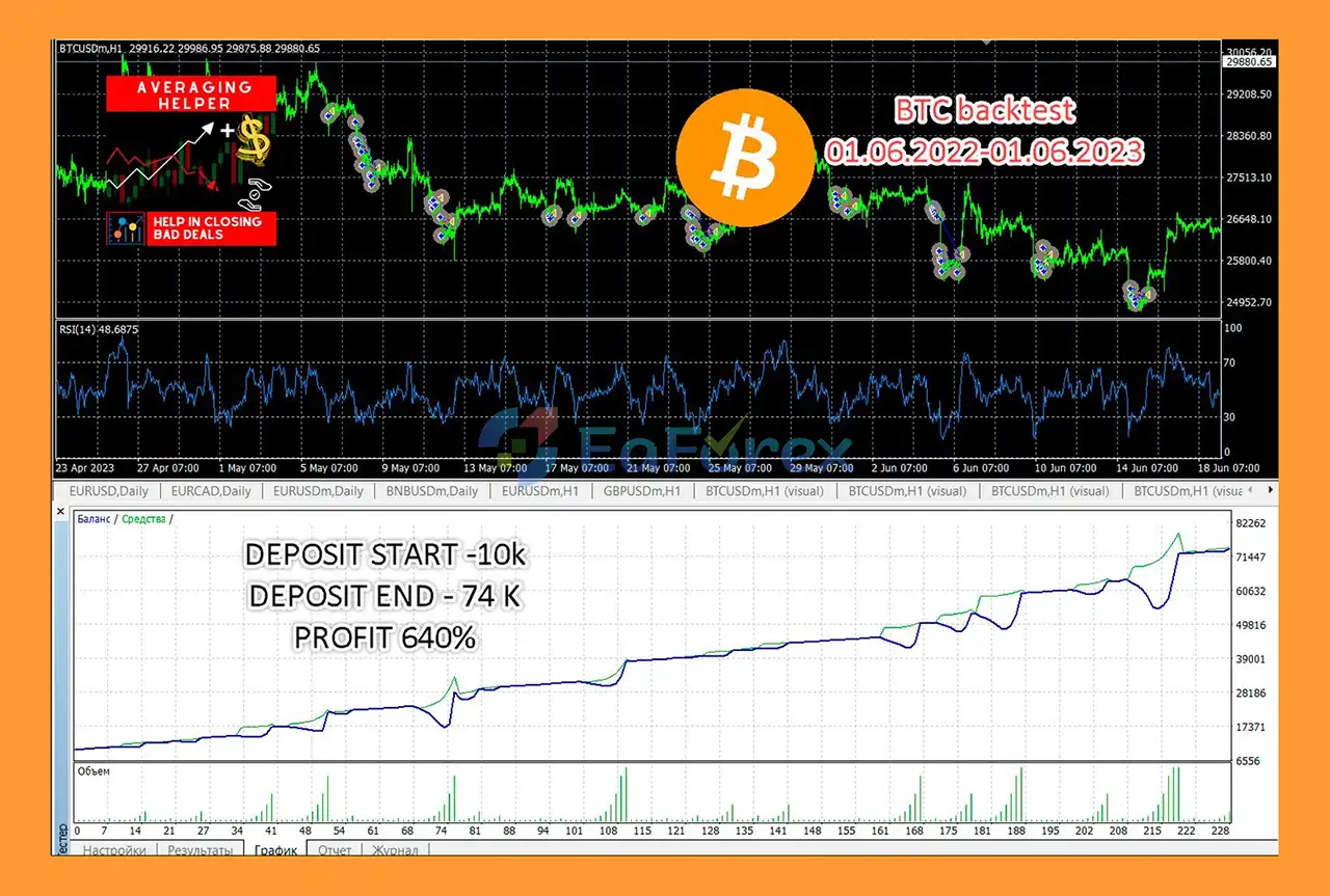According to provided data, a 1-year backtest on the BTC pair with a $10,000 initial deposit generated a total net profit of $74,000. However, past performance does not guarantee future results, and traders should perform their own testing under real market conditions.