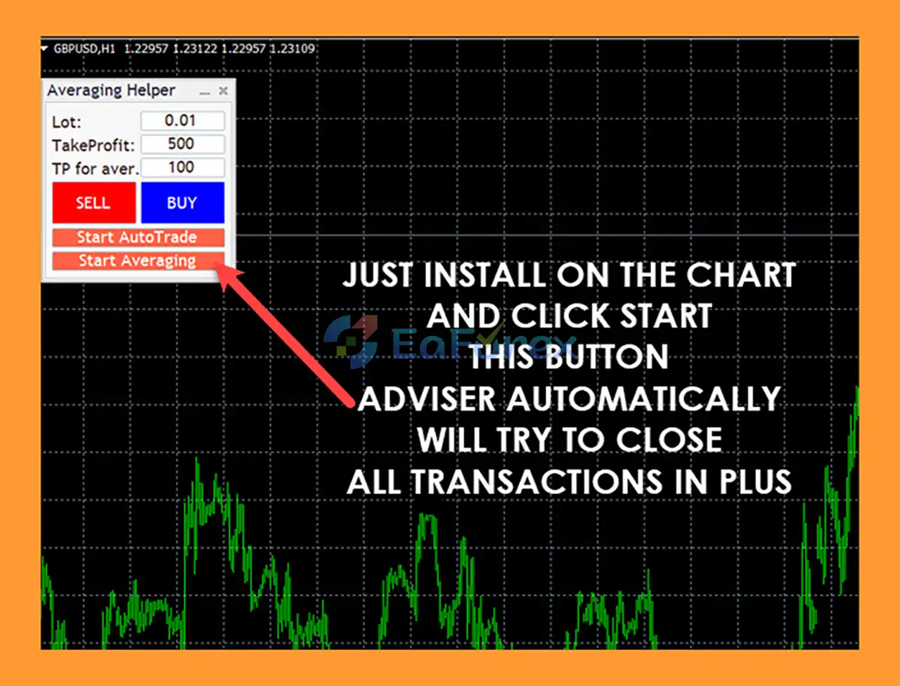 • Averaging Helper EA MT4 applies a loss recovery strategy by using position averaging to manage unprofitable trades effectively.