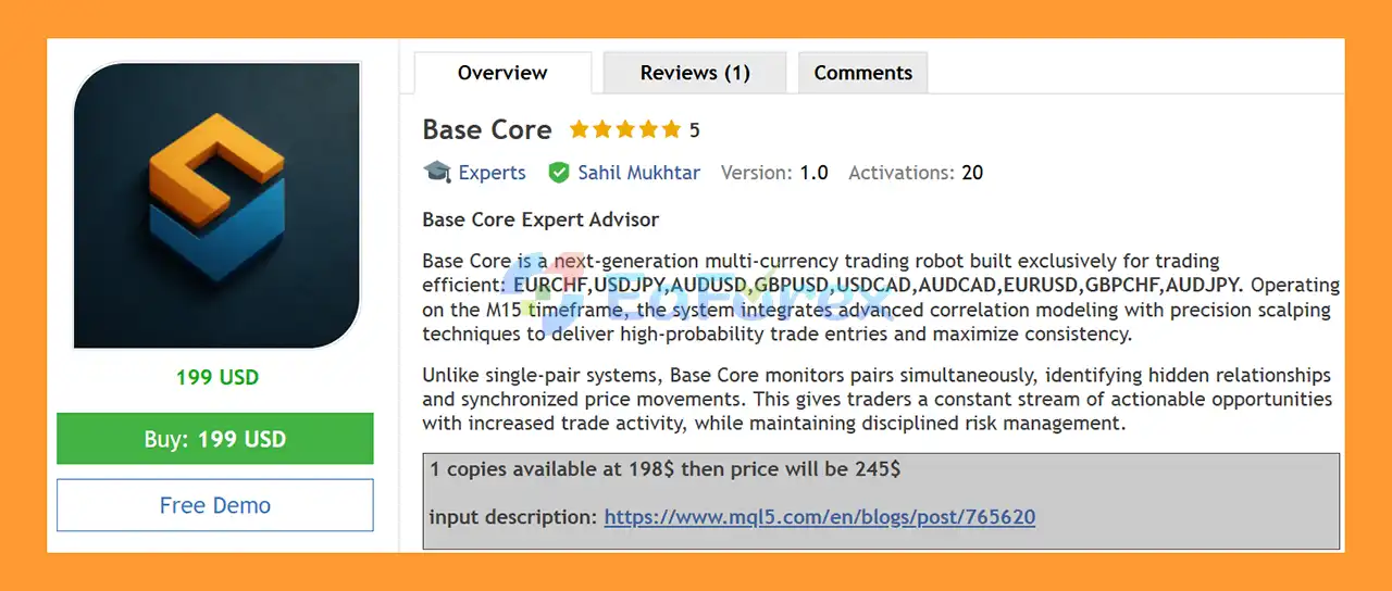 In summary, Base Core EA MT5 is a sophisticated multi-currency trading robot designed to take advantage of market correlations and short-term scalping opportunities across major forex pairs. With its advanced correlation analysis, automated execution, and disciplined risk management system, the EA helps traders identify synchronized market movements and capture high-probability trades efficiently. Combined with a high win rate, low drawdown performance, and a plug-and-play setup, Base Core EA MT5 offers a powerful and reliable automated trading solution for traders seeking consistent results on the MetaTrader 5 platform.
