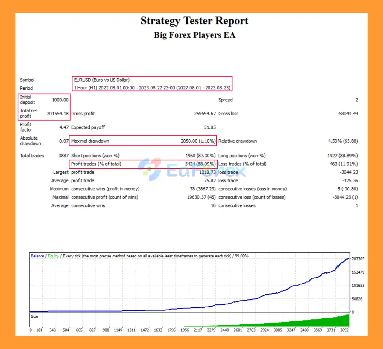 A backtest on EURUSD H1 (Aug 2022 – Aug 2023) shows: