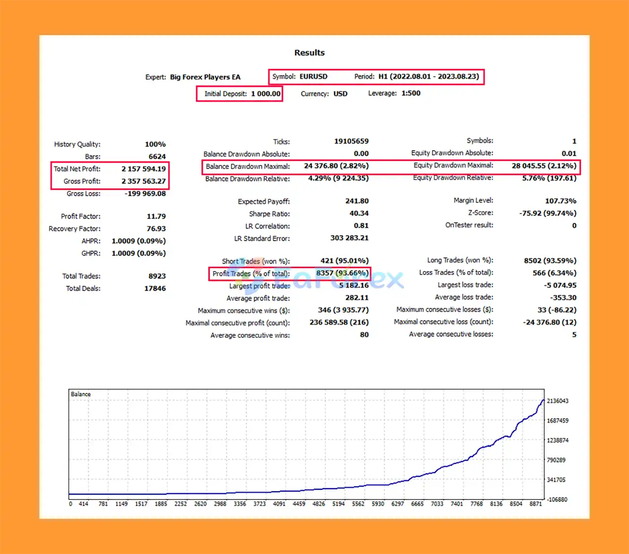 EURUSD (2022–2023): $1,000 → $2.16 million profit, 93.66% win rate