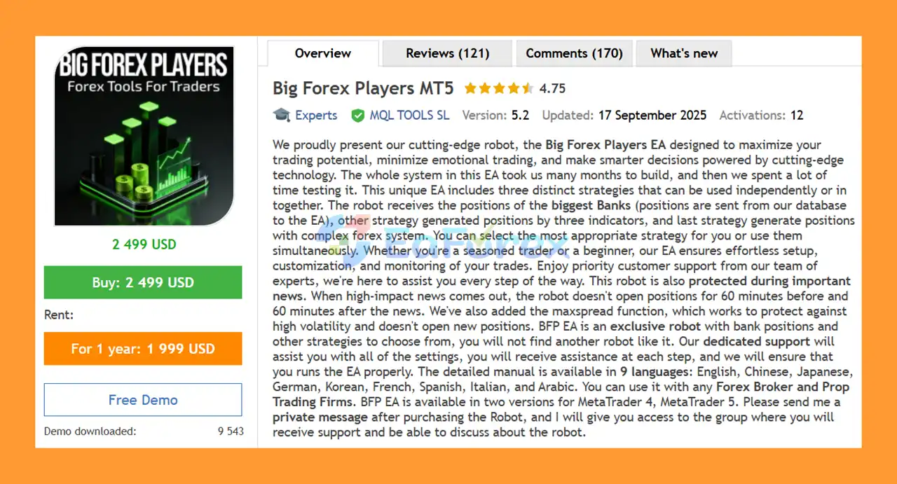 You should choose Big Forex Players MT5 because it delivers institutional-level trading intelligence in an easy-to-use format. Unlike most EAs that focus on a single method, BFP EA merges bank-level strategies, indicator analysis, and multi-currency algorithms for a complete trading ecosystem. It’s compatible with all brokers, prop firm–ready, and continuously updated to adapt to changing market conditions.