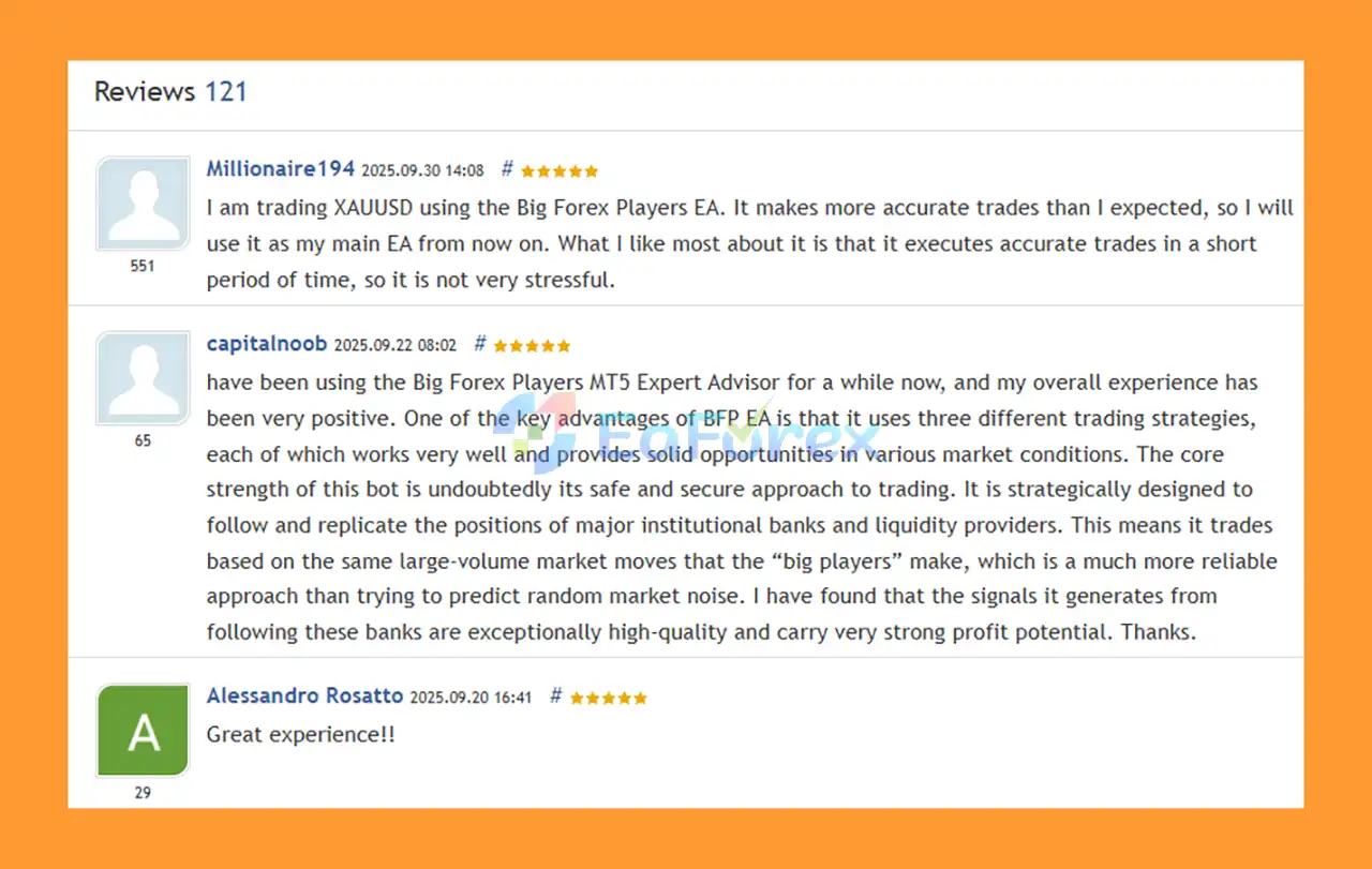 🔻Big Forex Players MT5 is highly appreciated by the MQL5 community for bringing stable and reliable profits. Below are 5 star reviews from users: