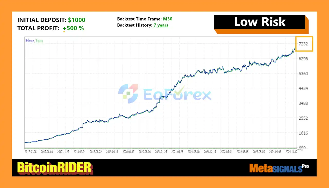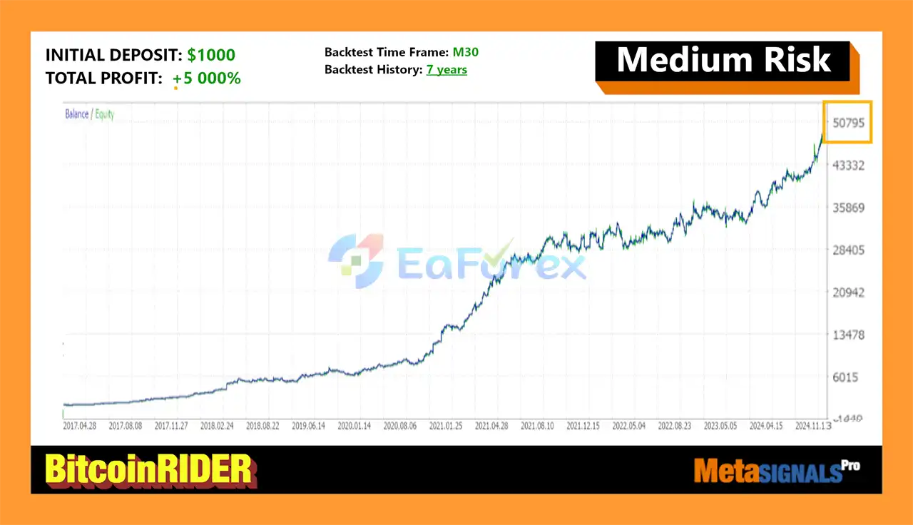 In summary, Bitcoin Rider EA MT5 is a specialized and highly effective Expert Advisor designed to capitalize on Bitcoin bull runs using a trend-following momentum strategy. By analyzing parabolic price movements and market volatility, it identifies optimal entry points while maintaining controlled drawdowns below 21%, making it suitable for both conservative and aggressive traders.