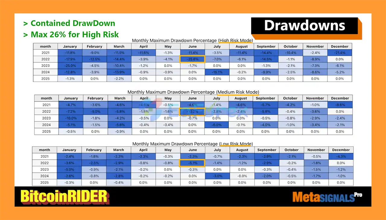 The EA maintains controlled drawdowns below 21% and allows traders to select conservative or aggressive risk profiles. This ensures safer trading while maximizing potential gains during Bitcoin bull runs.