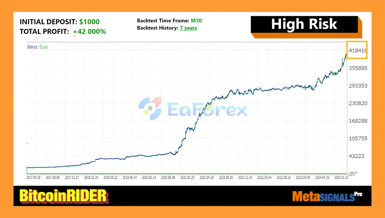 Bitcoin Rider EA MT5 is a trend-following EA that captures Bitcoin bull runs with controlled drawdowns, dual strategies, and proven long-term performance.