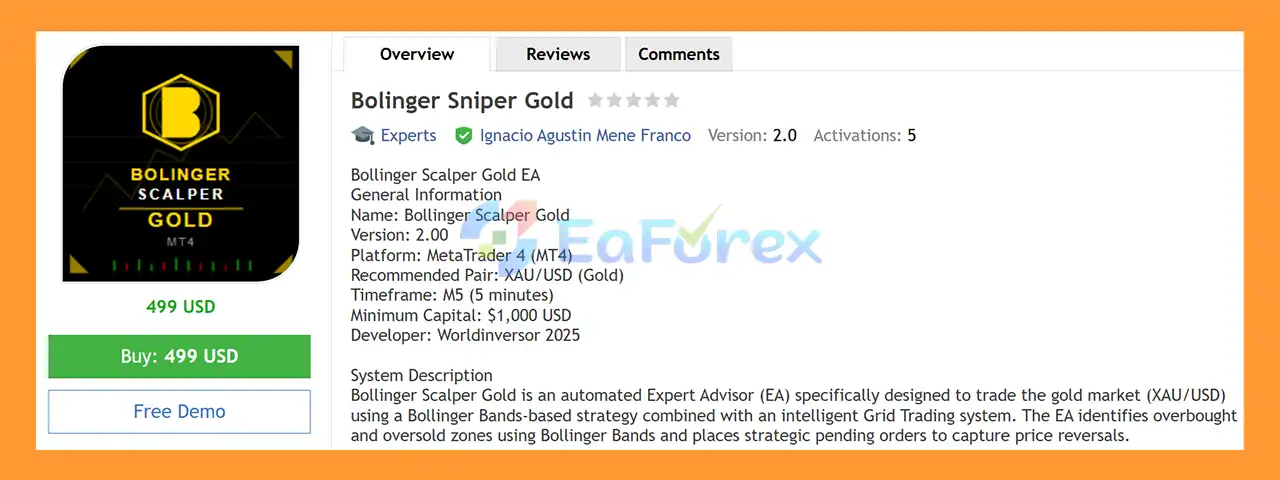 Bolinger Sniper Gold EA MT4 is a fully automated Expert Advisor designed specifically for gold trading (XAU/USD) on the MetaTrader 4 platform. It uses a Bollinger Bands strategy combined with an intelligent grid system to capture short-term scalping opportunities.