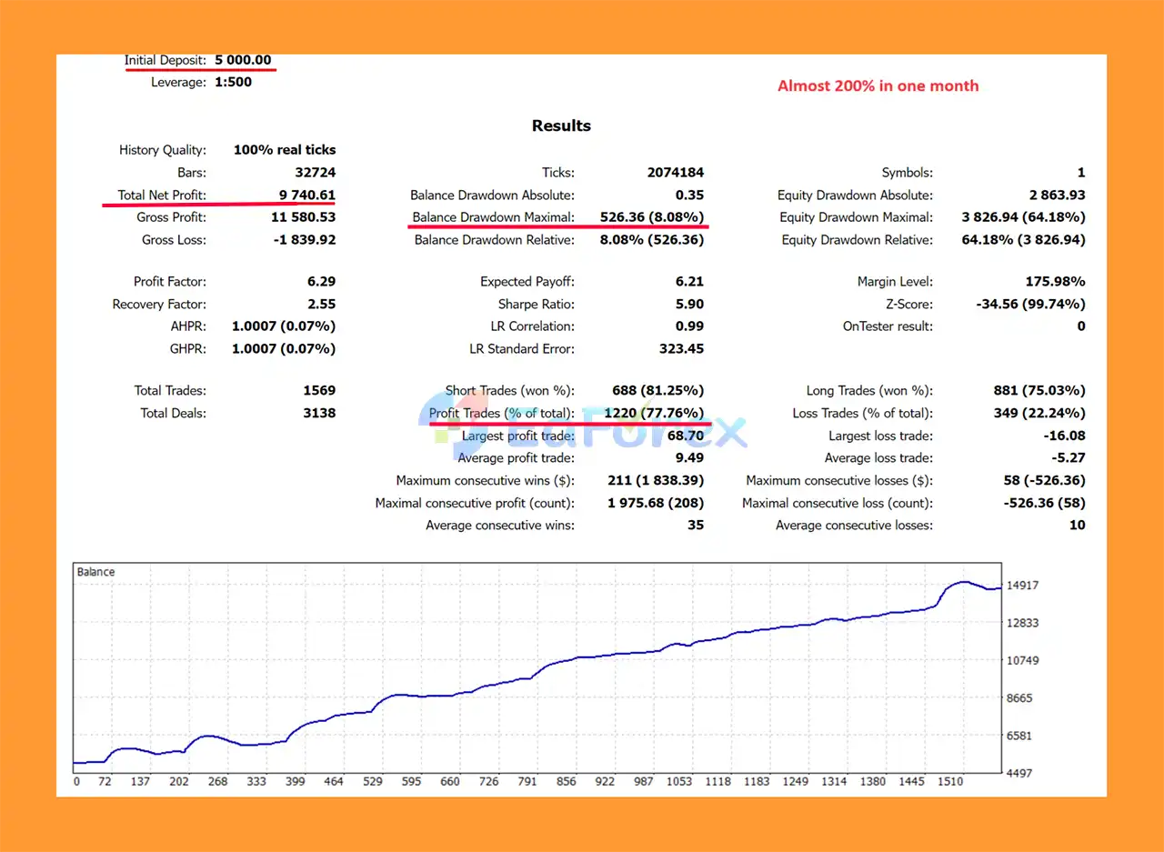 Live trading results show a total gain of +139% with a maximum drawdown of 4.8% and a win rate of 70.9%. Backtests demonstrate strong profitability with a net profit of $9,740 from a $5,000 deposit and a win rate of 77.76%, reflecting the EA’s high-reward trading potential.