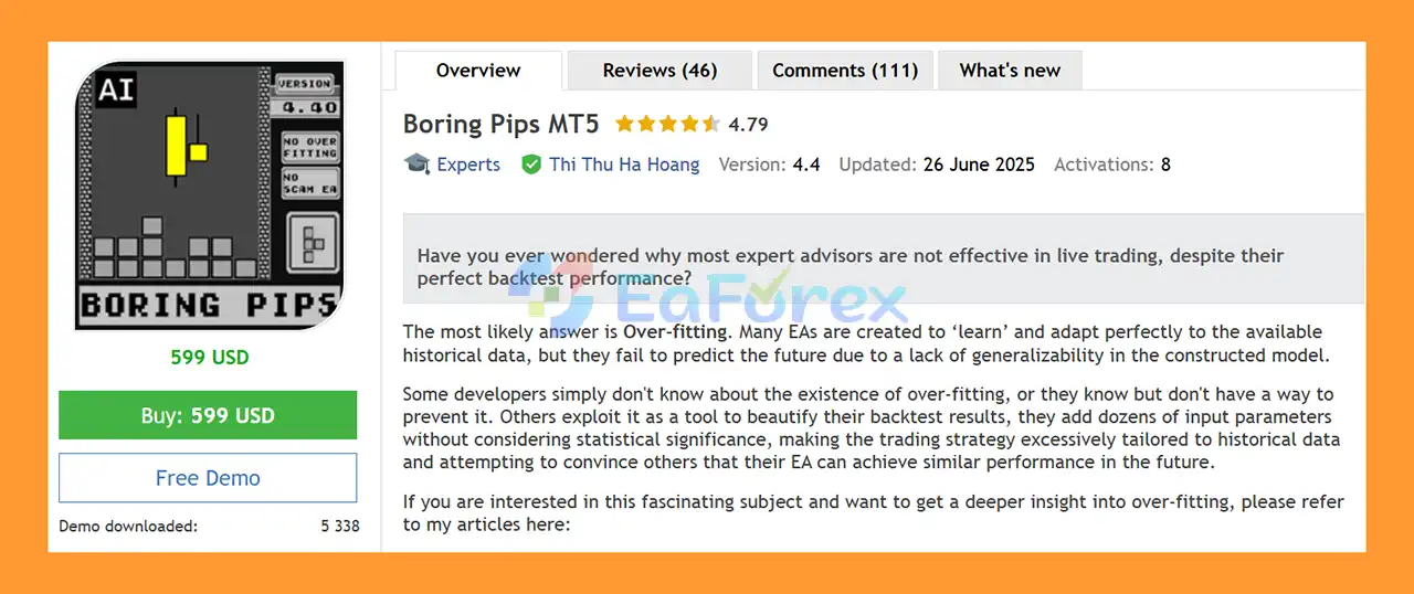 • Notable Products: Boring Pips MT5, Boring Pips MT4 and other advisors.