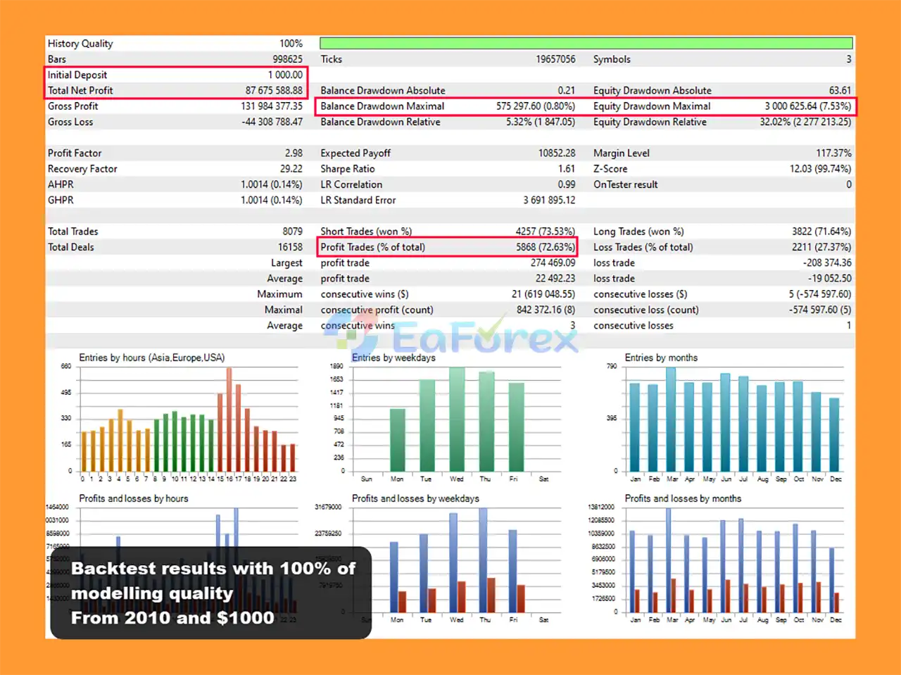 Backtests demonstrate a total net profit of $87,675,588 with a win rate of 72.63% and max drawdown of 7.53
