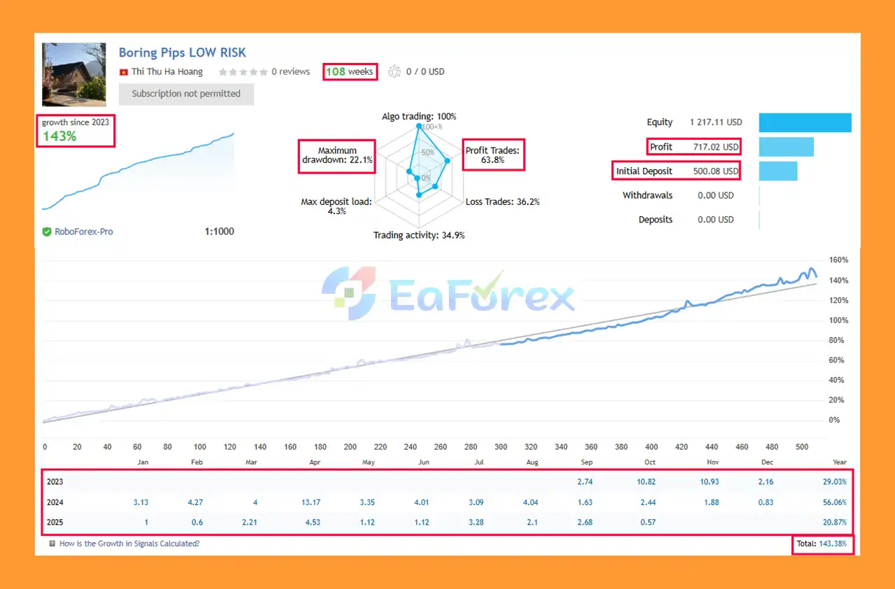 Low Risk EA: +143% net profit from a $500 deposit over 108 weeks, max drawdown 22.1%