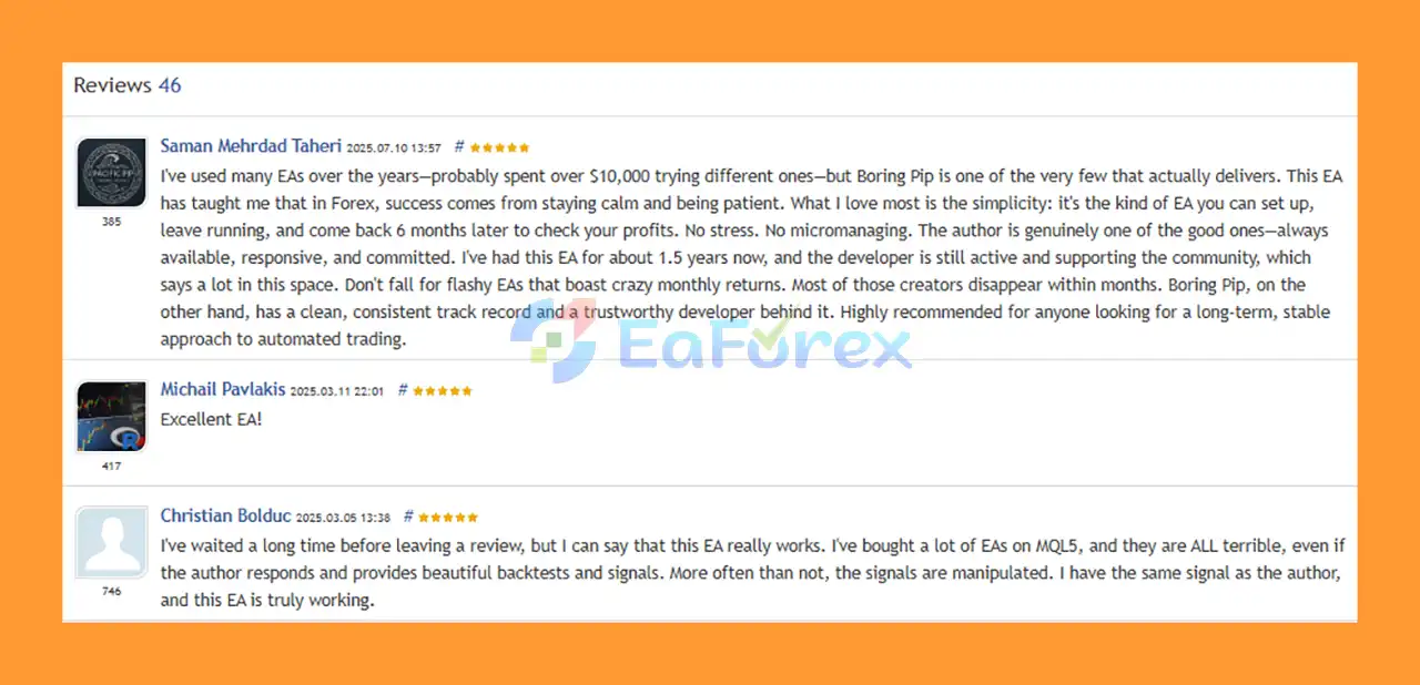 🔻 Boring Pips MT5 is highly appreciated by the MQL5 community for bringing stable and reliable profits. Below are 5 star reviews from users: