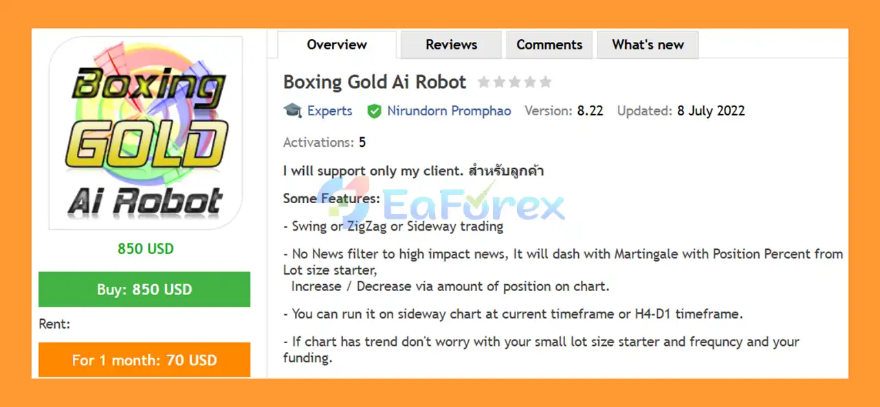 • Boxing Gold Ai Robot EA MT4 Reviews – Multi-strategy gold trading with Martingale and trend adaptability.