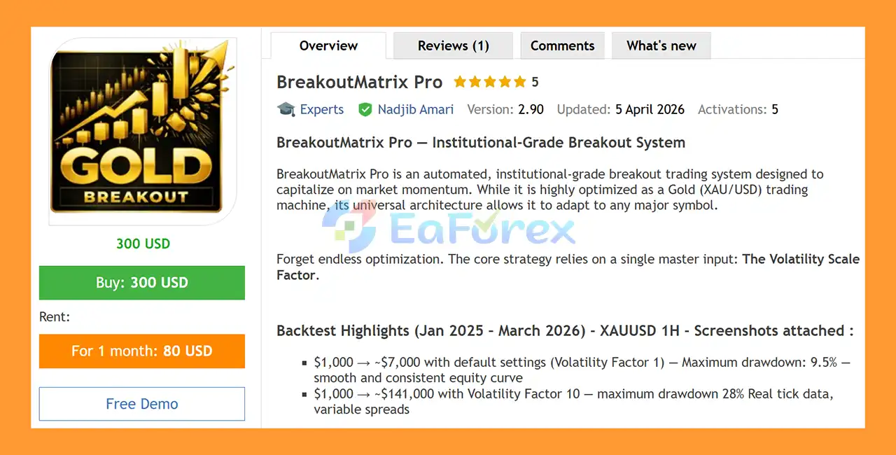 BreakoutMatrix Pro EA MT5 is an institutional-grade Expert Advisor for MetaTrader 5 that uses a momentum breakout strategy to capture strong market movements, especially in XAUUSD (Gold) and other major trading instruments.