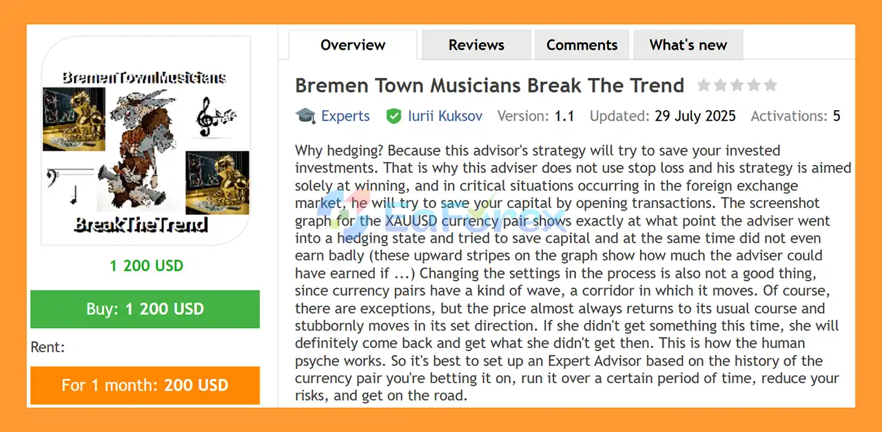 Bremen Town Musicians Break The Trend MT4 is a capital-preservation Expert Advisor for MetaTrader 4 that uses a hedging-based trend and countertrend strategy, primarily optimized for XAUUSD (Gold) trading.