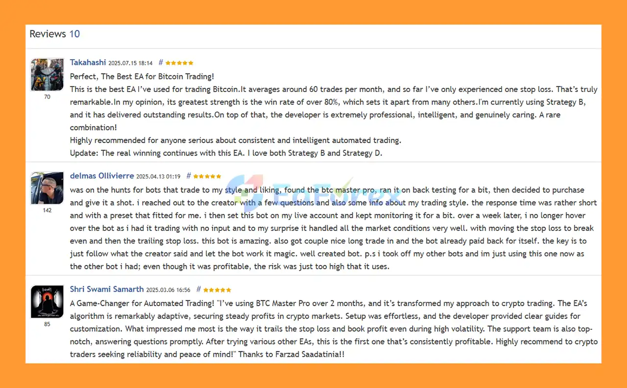 🔺BTC Master Pro MT5 is highly appreciated by the MQL5 community for bringing stable and reliable profits. Below are 5 star reviews from users: