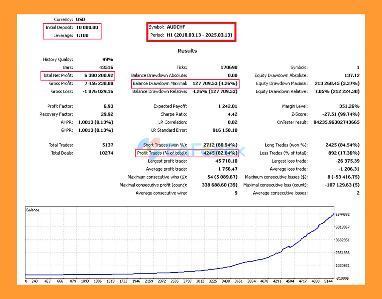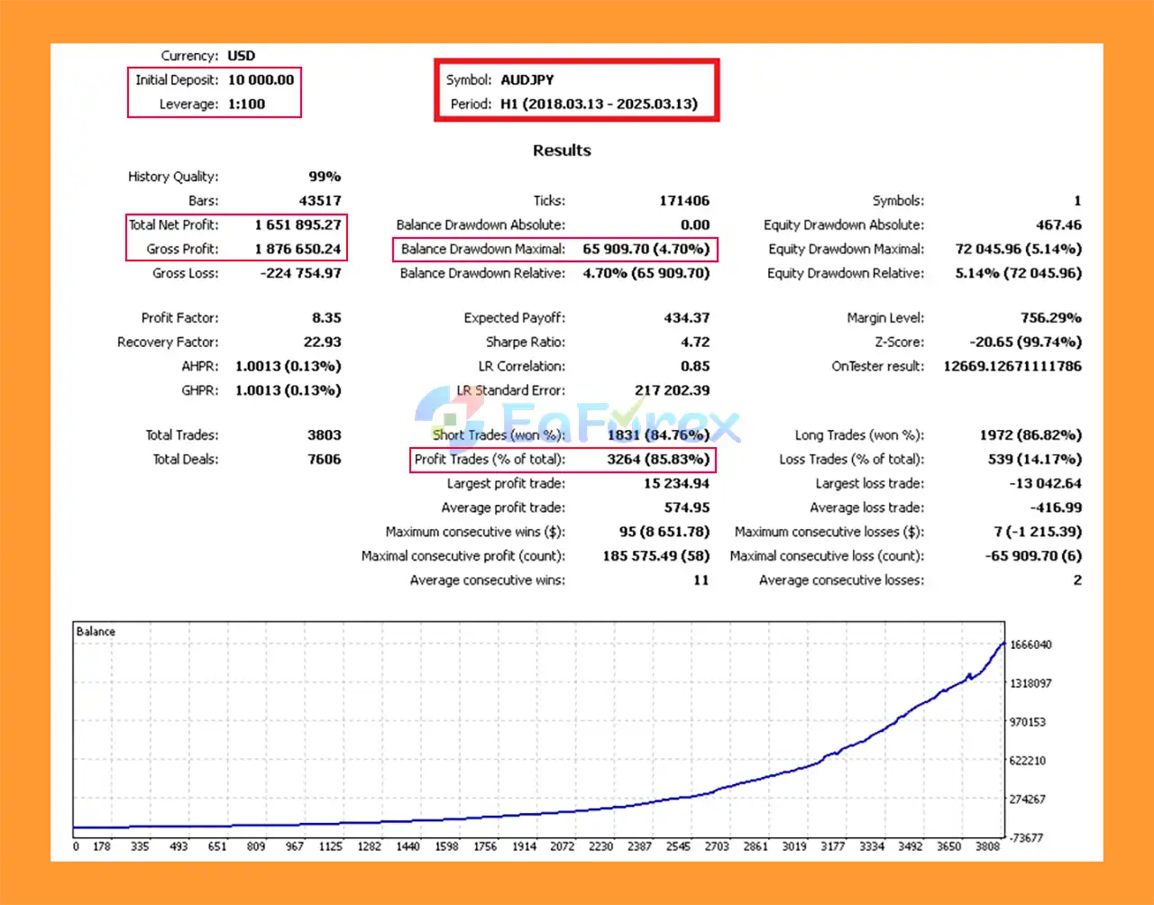 Backtests over 7 years on multiple pairs, such as AUD/JPY, EUR/USD, and AUD/CHF, show win rates above 82% and low drawdowns (4–6%), demonstrating the EA’s stability and long-term reliability.