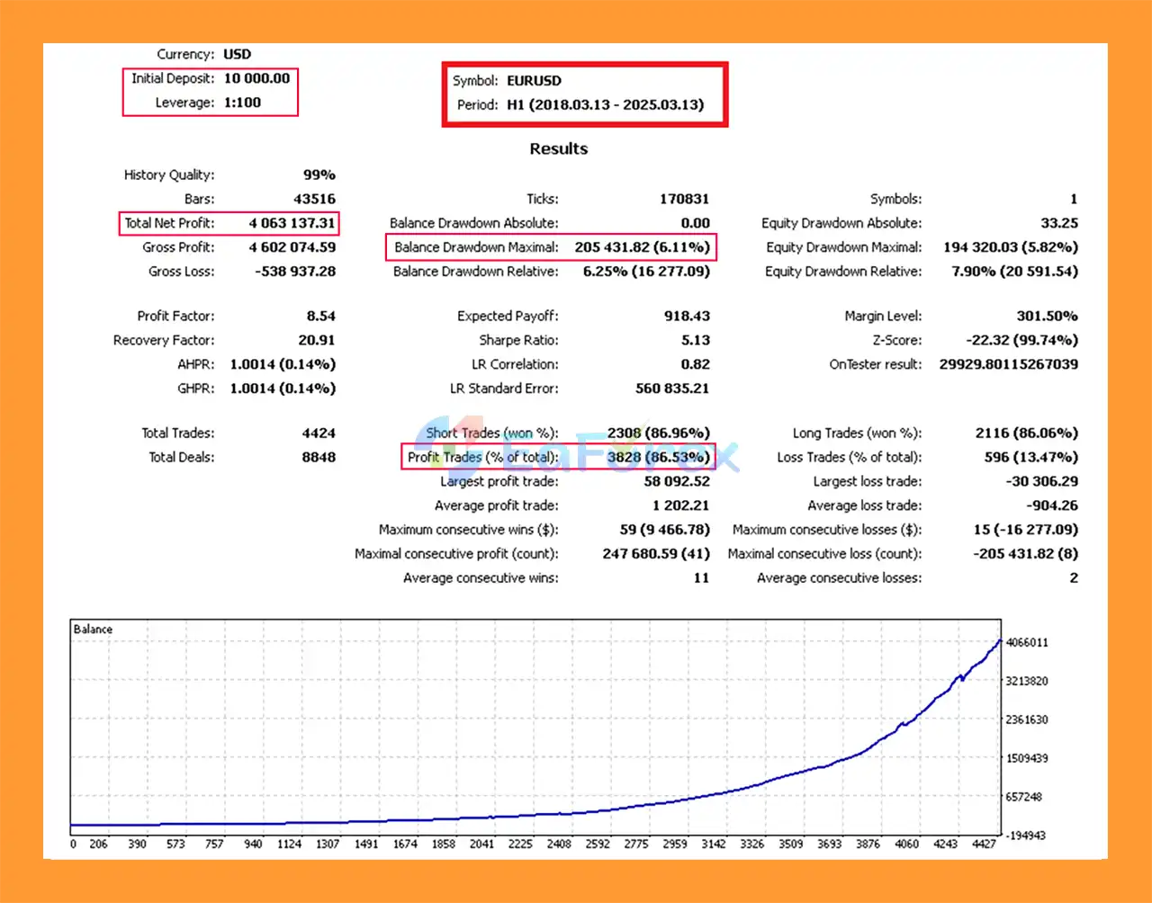 The EA works with accounts starting from $1,000, with optimal performance observed from $3,000. Dynamic money management ensures trades are sized appropriately based on account balance.