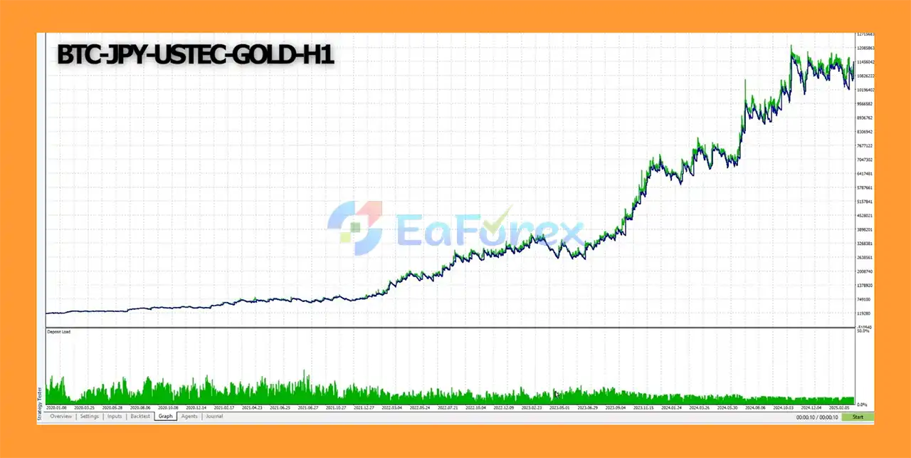 The EA follows trend-based setups with asymmetric risk-to-reward ratios, allowing profits to run while minimizing drawdowns. It identifies strong market trends using multi-timeframe analysis from H1 to Daily charts.