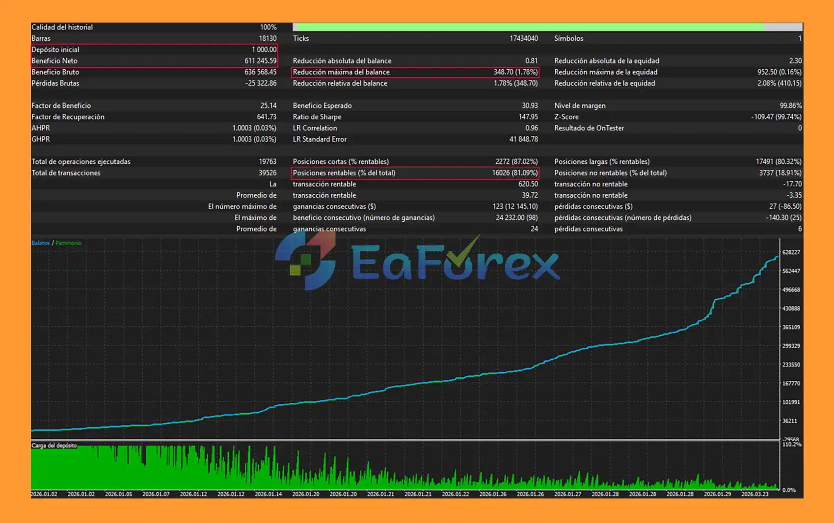 Backtests show strong performance with an initial deposit of $1,000 generating approximately $611,245 in net profit, an 81.09% win rate, and a low maximum drawdown of 1.78%.