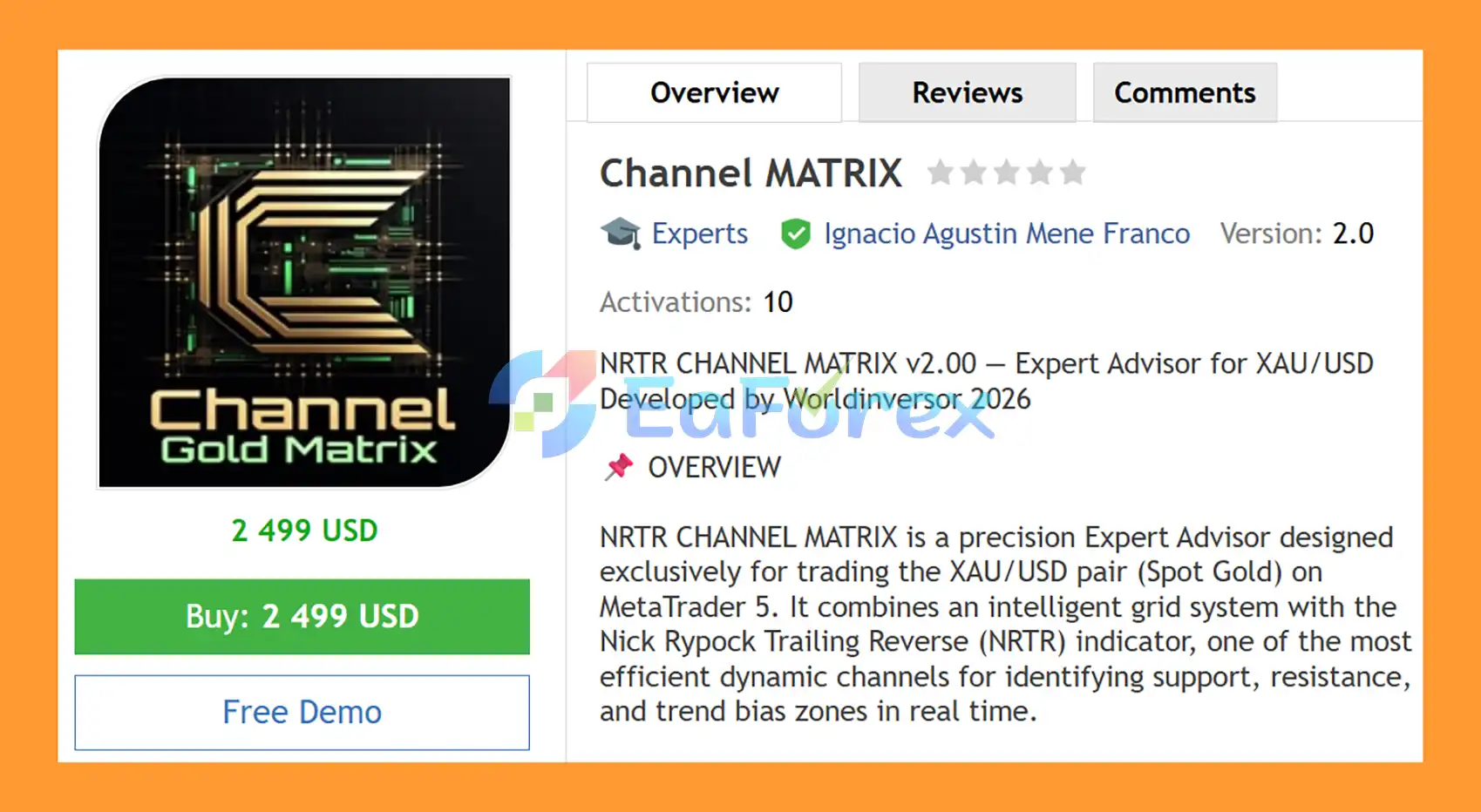 Channel MATRIX EA MT5 is an automated trading Expert Advisor for MetaTrader 5, designed specifically for trading XAU/USD (Gold). It uses the NRTR (Nick Rypock Trailing Reverse) indicator to build a dynamic price channel that helps identify trend direction, support, resistance, and overextension zones.