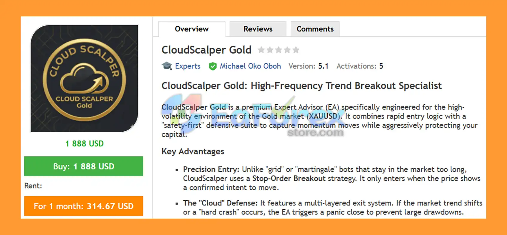 • Notable Products: CloudScalper Gold EA MT4 and other advisors.