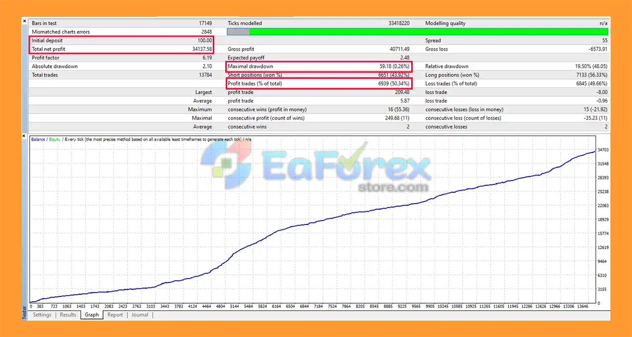 Based on backtest data, the EA has shown strong long-term profitability with low drawdown levels. However, real trading results may vary depending on market conditions, broker settings, and risk configuration.